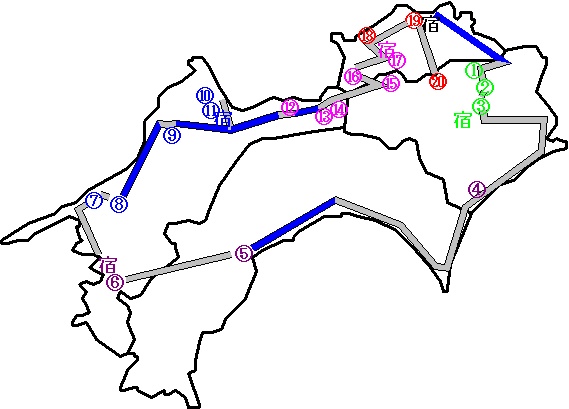 集合は香川県の高松ですので、別格20ヶ寺では第19番札所の香西寺が 近いのですが、参拝は札所の番号順に徳島県の第1番札所の大山寺からです。 今回は1〜20番の全てを番号順に巡りました。 札所および宿泊地との位置関係は、上右の地図(クリックすると拡大できます) を参照して下さい。何故か15番・20番札所は徳島県なのです。 色は巡った日ごとに分けています。道路の青は高速道路利用区間です。