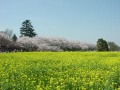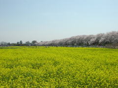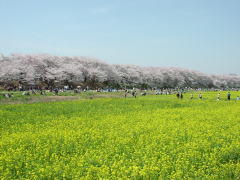 日光道中幸手(埼玉県内で東武動物公園の少し北、日本橋から50キロ地点)の権現堂桜堤というのも有名だが、桜の季節には初めて訪れた。桜並木は850メートル続く。桜も良いが、菜の花の黄色との彩がなかなか良い。駐車場もあるが、道の渋滞が激しい。