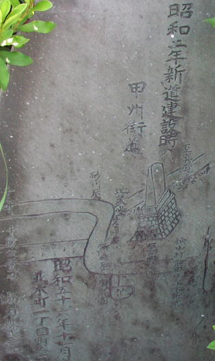 左の写真は大きな石の道標である。右高尾山 左真覚寺道 と彫られている。この道標の脇に昭和2年新道建設時の甲州街道の様子を石に彫ったもの(写真:30kB)があるが、そこにも一里塚は描かれていない。角々と曲がる道ではあったようだ。この道は300mほどで国道に合流する。