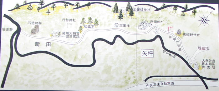 しばらく進むと日本橋から19里の大椚一里塚跡がある。ここの説明板は風雨で大変読みづらくなっている。道は登りが続く。吾妻神社を過ぎた辺りで登りは終り、中央道沿いの道を進むが、ここで大きな間違いをしてしまった。中央道沿いになった後、中央道を横断し、野田尻に向かうということで、途中の中央道をくぐる道へ曲がってしまったのである。その後の道がくねくねしていたので、どっちに進んでいるのかよく分からなかったのだが(曇っていたので太陽による方角も分からなかった)、思わぬところに中央道が現れた。橋を渡り進むと見覚えのある風景が・・・。鶴川から大椚に向かう道に戻ってしまったのである。約40分のロスタイム。野田尻に向かうには中央道を上を渡るのである。標識も出ている。ただし、本当の旧道はもう少し先から中央道を渡り野田尻に向かうとする文献もある。