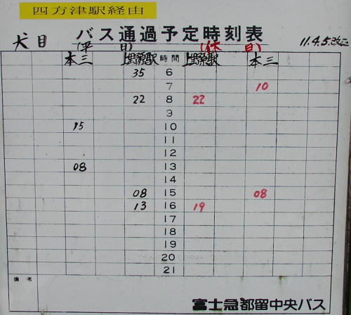 石畳が終ると県道に合流し、少し進むと大月市に入るが、ここからはひたすら下って行く。山谷にはバス停もあるが、大月に向かうバスは1日に1本程度である(時刻表)。車道は大きく蛇行するが、歩行者は通学路と書かれたところを進んだ方が近道である。