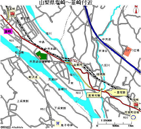 実際の甲州ウォークのとき私はショッピングセンターのところ(竜地交差点)を左に曲がり、JR線の手前で旧道に合流した。当時は建設中であった中部横断自動車道は、2002年に双葉−白根間が開通した。中央線のガードを潜ったら線路沿いの道で韮崎へ向かう。