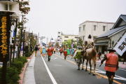 塩川橋を渡ると道が二手に分かれるが、JR沿いの左の道を行くのが旧道である。しばらく真っ直ぐな単調な道が続く。鰍沢道(身延道)との合流点である下宿交差点からは、この日は「武田の里まつり(武田勝頼公新府入城祭り)」で約1キロにわたり歩行者天国になっていた。商店街に本陣や風林火山の陣屋が設けられ、時代絵巻行列のパレードなど、街道歩きに似合う催しを見ることができた。