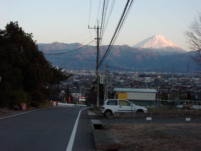 中央自動車道をくぐった辺りから竜王町となる。駅前へ向かう道を通過し、次の竜王新町交差点を甲州街道は右折する。JR線の踏切を渡り、しばらく進むと坂道となる。初めて歩くときは道が間違っていないか不安であったが、登っていった。この坂が赤坂台地である。実際の甲州ウォークのときには見ることができなかったが、ここからの富士山の眺めは良い(左写真、街道も写っている写真はこちら)。坂の上は最近になって開発が進んでいる。竜王町と双葉町の境辺りはかつては三軒茶屋と呼ばれる茶屋があったそうだ。