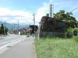 JR線沿いの道は、甲府敷島韮崎線という県道である。塩崎駅の手前、道の左側に大きな「泣石」がある。鉄道が開通する前はこの大きな石の中央から水が流れ出ていたそうである。塩崎駅前を通過し、少し進むと昔ながらの雰囲気のある家が数件ある。さらに進み、小学校を超えガソリンスタンドの手前辺りに志田の一里塚があったそうだ。今はそれらしい碑などはない。(追記:小学校手前の三界万霊塔の少し先が志田一里塚跡のようだ) 少し進むと芭蕉の句碑がある。