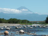 実際の甲州ウォークのときは道を直進してしまったが、旧道は田畑の交差点から右の道に入るようだ。JRの線路脇の道よりひとつ手前で左折。道なりに進み、金剛寺の方には行かず、道を下り元の県道に出る。以前はここ(現在の塩川橋より約200メートル下流)で塩川を渡ったそうだが、これは明治期のルートであり、江戸期には現在の塩川橋に近い位置で渡っていたとする文献もある。塩川橋を渡ると韮崎市に入る。塩川と富士という構図もなかなか良いものがある。