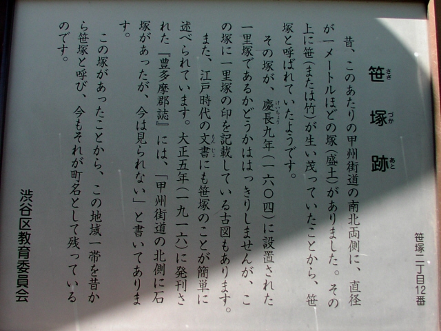 京王線笹塚駅付近の国道20号の右(北)側に笹塚の説明板があります。説明板は国道沿いの歩道ではなく、交番前の路地を挟んだ向かい側にあり木の陰で見つけづらいです。この辺りの街道両側(南北)に直径1mの盛土があり、その上に笹(竹?)が茂っていたことから笹塚と呼ばれていたそうです。はっきり一里塚としているわけではありませんが、距離的にも笹塚=一里塚なのでしょう。