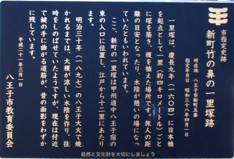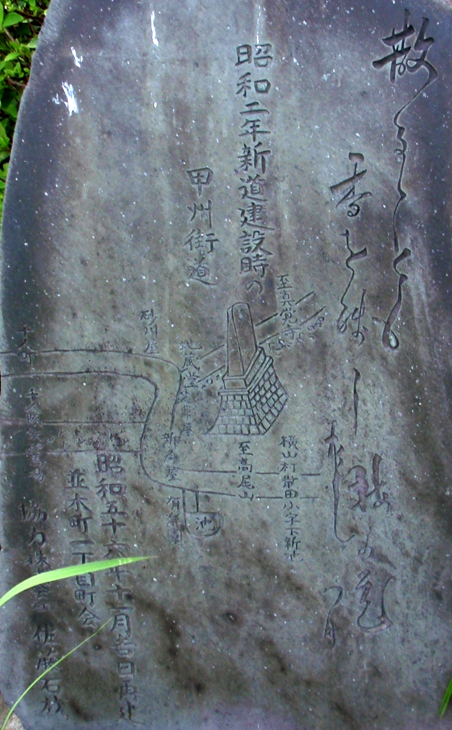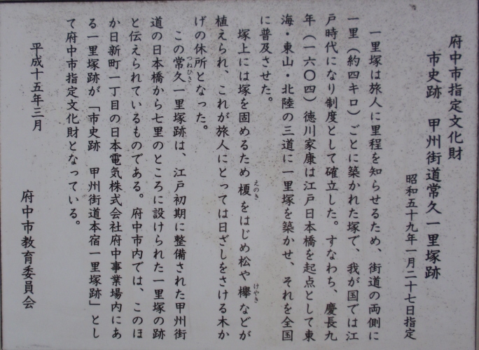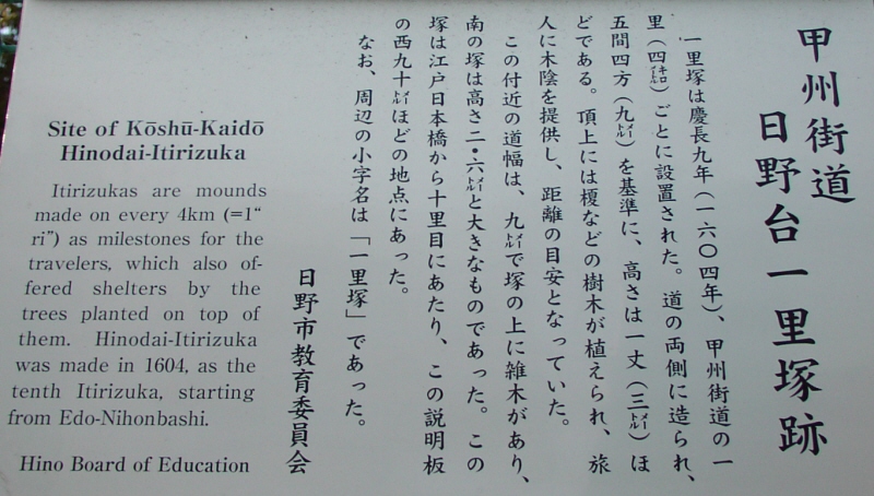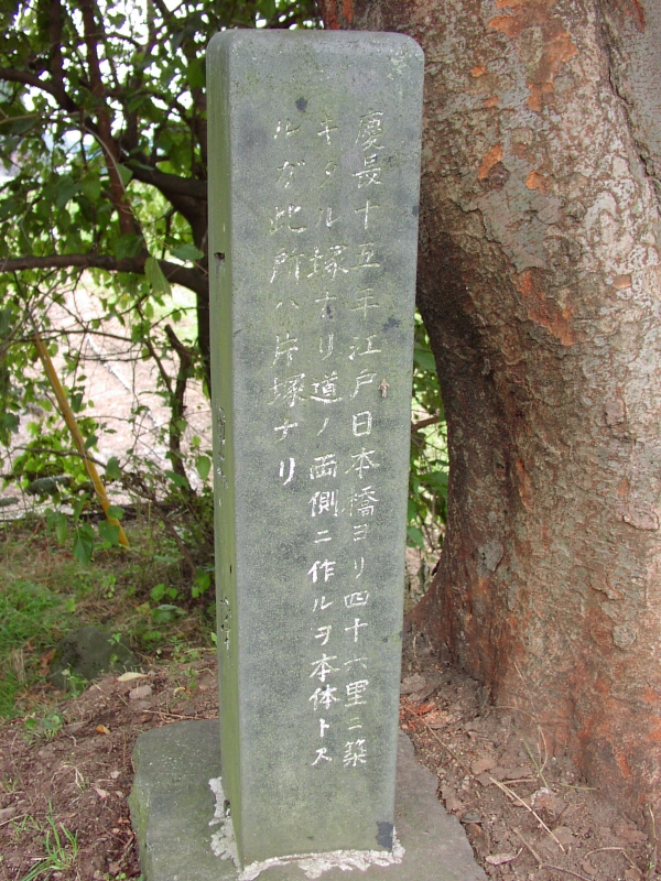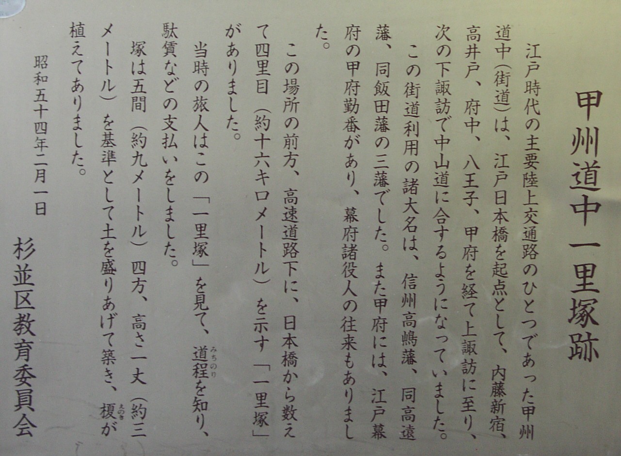 京王線上北沢駅近くの国道20号と首都高速道路が分かれていく辺り(鎌倉街道入口交差点付近)、国道20号の左(南)側の16kmポストがあるところに一里塚の説明板があります。1里は4kmではなく、3927mなので、もう少し東側のような気がしないでもありません。桜上水駅近くの国道20号に「一里塚」というバス停があります。今井金吾さんの今昔三道中独案内によると桜上水駅近くの国道沿いに一里塚が示されています。また、平成10年(1998年)東京都教育委員会発行の「歴史の道