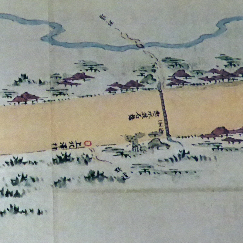 今昔三道中独案内や歴史の道調査報告書、分間延絵図にも記載はありませんが、天保国絵図には徳島堰と甲州道中が交わる地点に描かれています。こんな特徴的な場所なら間違いないと思うのですが。1838年の天保国絵図は、既に無くなっている一里塚もすべてプロットされています。編纂にあたり、既に無いところは1里に相当する場所を記す決まりがあったようですが、幕府による国絵図事業なので全くの適当ではないと思います。