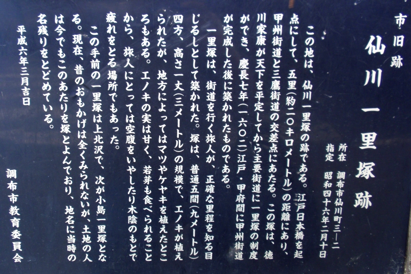 京王線仙川駅近くの国道20号の仙川駅入口交差点の角にあるコンビニ前に石碑があります。往時、塚は左右にあったようですが、木立はなかったとされています。