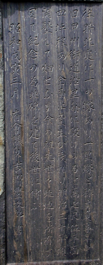 ここから台ケ原一里塚の石碑まで約2キロです。この矛盾を説明する資料が見当たりません。台ケ原の石碑が出来るまでは疑うことはなかったのでしょう。しかし、今でも一里塚跡としてカウントされていることには疑問を感じます。台ケ原は甲州道中の宿場だったことを観光地としてもアピールしているので、色々と見ていると時間が経過し、七里塚から近いとは気づきにくい面もあるのでしょう。あくまでも甲府から七里の地点であり、江戸初期に造られた一里塚が存在していたわけではないと思います。建立者が個人名なので行政が設置したものではないようです。