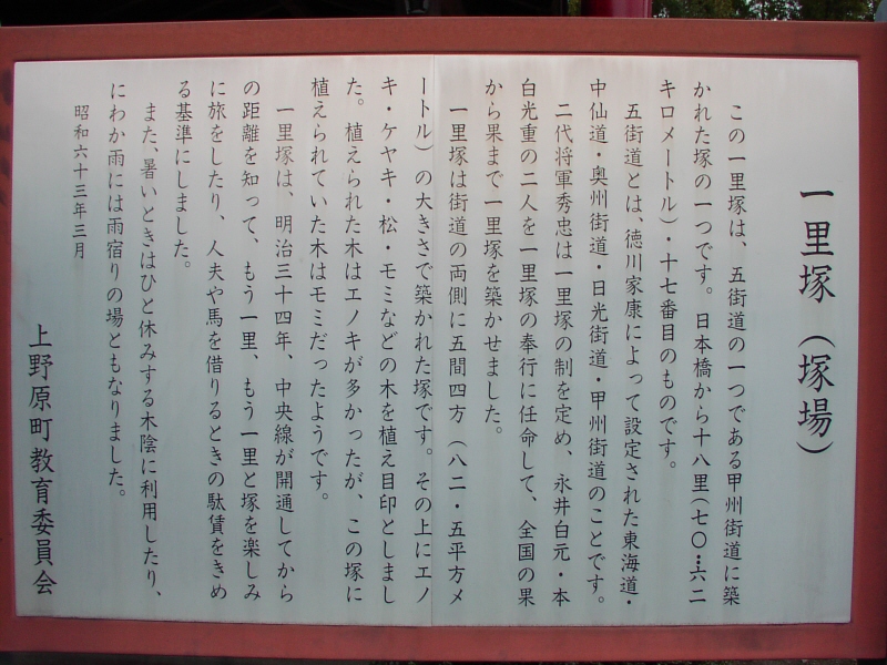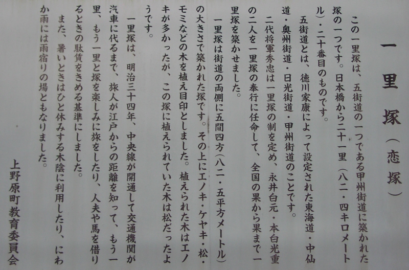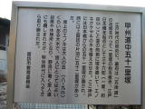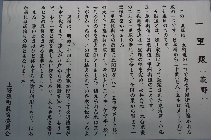 石碑の横には五十三里と刻まれていますが、説明板は五十三里ではなく、53番目と書かれています。おそらく長野県では、53から数え始めたのではないでしょうか。武川付近の六里塚・七里塚を数に入れた方が説明上は楽になりますね。説明板の記述に「道の中央を測って」とありますが、本当にそうなのでしょうか? それほど厳密なものとは思えません。丁度53里の地点に53番目があると厳密だと信じてしまうかも。
