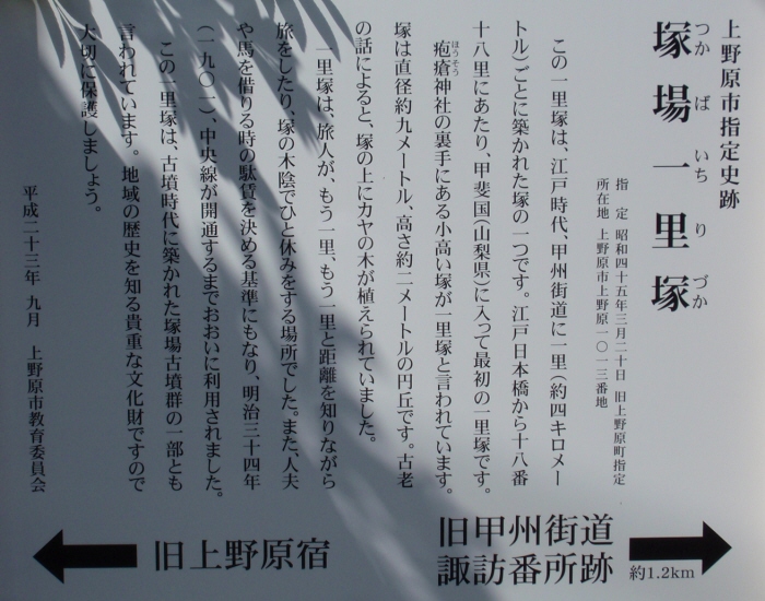 甲州道中で両側に塚が残るのは唯一ここだけです。富士見町の指定文化財ですが、長野県としては指定されていないところが不思議です。ちなみに一里塚で長野県指定文化財になっているのは中山道の御代田一里塚のみです。