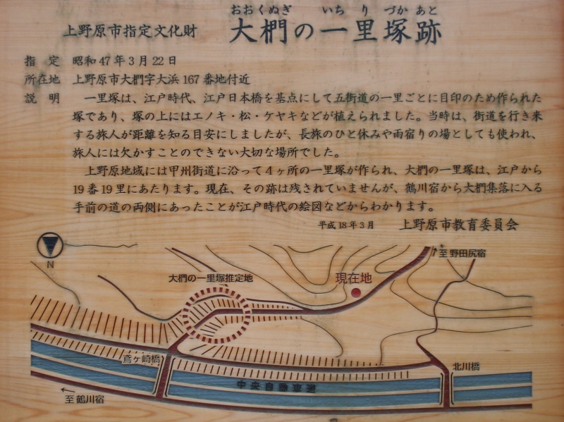 横吹の集落を抜け、国道に合流して500mほどのところの畑の中に、2001年に標柱が建てられました。塚はないので甲州市の文化財には指定されていませんが、ここから10里も一里塚跡を示すものがないので貴重です。標柱には「横吹の一里塚は、旅人がその日の行程を知る道標であり、疲れを癒す休憩所でもありました」と書いてあります。