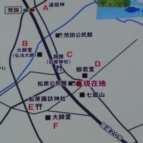 分間延絵図に描かれています。解説書に現在位置は不明と書かれていますが、絵図に字松原という地名や七面之社があり、道のカーブから推定すると、松原公民館付近に相違ないと思われます。