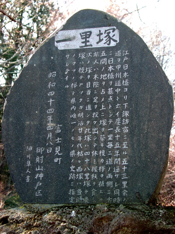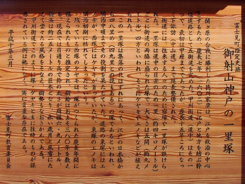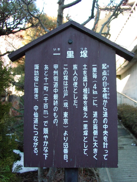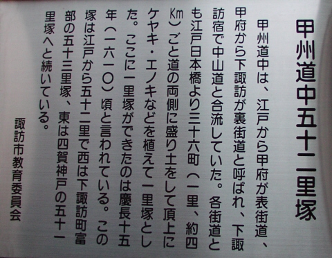 甲州道中の一里塚、一般的には53ケ所です。長野県内の一里塚が江戸からそれぞれ46里から53里と説明されているために53というのが動かしがたいところです。しかし、このページで紹介するのは下諏訪近くの富部を52番目としました。