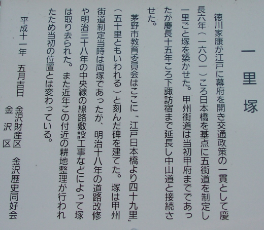 石碑と説明板もあり、国道20号からも辛うじて確認可能です。しかし、川向うなので、近づくには回り道が必要となります。分間延絵図でも川向うに描かれています。説明板には「また近年この付近の耕地整理が行われたため当初の位置とは変わっている。」とあります。次の茅野の説明板には、ここの一里塚を「金沢木舟の四十九里塚」としています。
