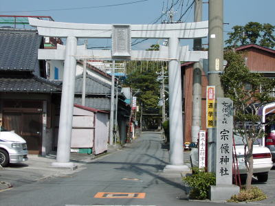 東海道を進むと右手に宗像(むなかた)神社(写真左)(参道入口)がある。ここの境内の森は「女体の森」と呼ばれているらしい。女体盛り!? なんとも客引きなネーミングだ(それに釣られて入ってしまう方も・・・)。昔は沖合いからそのように見えたらしい。女体ではなく、「母なる森」として親しまれたとする本もある。今でも「お宮の森・お寺の森百選」に選ばれている。