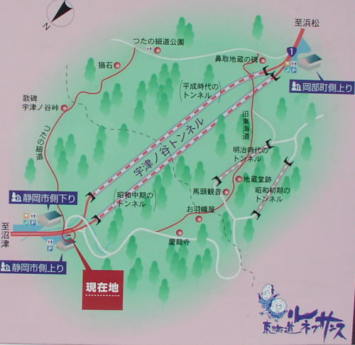 宇津ノ谷(うつのや)トンネルの手前の国道沿いに道の駅があるが、右側(上り線側)には売店はない。というよりも、ここの道の駅は上下線で異なる位置にあると言った方が正しい。上り線用は、新宇津ノ谷トンネルを貫けたところ(クルマ利用者からみればともにトンネルの手前)にある。この道の駅から見るに(写真左)、峠といってもそれほど大変そうな感じはしない。道の駅にある宇津ノ谷峠付近の地図を見て道を確認。