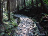 西へ向けての下りは、比較的開けたところを通る。最近作られたような石畳や人工的とは思えない歩きにくい石畳もある。下りも15分程度で西側の出入り口に到着する。ここから東海道に合流する地点まで500m以上歩くが、つたの細道公園内をのんびり歩くのもよいものだ。