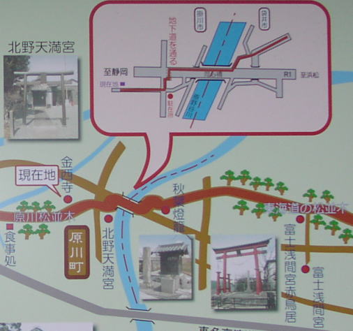 大池一里塚跡を過ぎ、しばらく歩くと掛川バイパスのインターと交わるため、少し複雑になる。高架下をくぐり、左折し、斜め右に入る道が旧道である。原川松並木があり、この辺りは間の宿だったらしいが、今は賑わいはない。