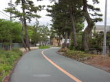 東海道を西へ進むと、左右に蛇行した道に土塁を残した松並木が続く(写真下)。富士浅間宮の赤鳥居を過ぎると、左手に妙日寺があり、その隣の小学校の庭に江戸から60里目の久津部一里塚跡がある。午後6時を過ぎ、辺りが薄暗くなり始めると常夜灯の明かりも良いものである(電線が見えなければもっと良いのに・・・)。