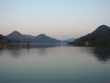七ヶ宿湖はダムになっており、かつての渡瀬宿はダムの底に沈み跡形もないそうだ。七ヶ宿湖沿いに道の駅があるので立ち寄った。左下の写真は、道の駅から西へ4キロほど進んだ湖の西外れの辺りから撮ったものである。街道をさらに西へ少し進んだところが関宿で町の中心地らしい。さらに西へ進んだ滑津宿には安藤家本陣(実際に住んでいるので内部は非公開)がある。その前に立つ吉野屋は牛丼屋ではなく旅人宿・そば屋のようだ。そこから数百メートル西に今回ここに立ち寄った最大の目的である滑津大滝がある。高さ10メートル、幅30メートルの二段滝である。