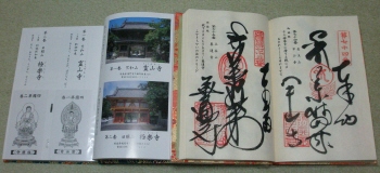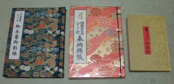 納経帳であるが、週刊「四国お遍路の旅」の定期購読の特典として付いていたもの(左下写真の右端)は、紙の材質が悪く、墨で書いたり朱印を押した時に乾きにくいのでお寺での評判が悪いという情報を得ていたので、五千円出して良い物を買い求めた。大きさも違う。