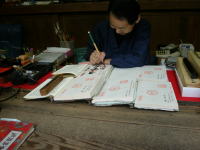 本来、最後に納経帳に御朱印を頂くのだが、時間の都合もあり、先達さんが先に納経所へ行き、みんなの分の御朱印を頂いてくる。お寺側も団体の場合は、まとめて出してくれることを希望しているようだ。