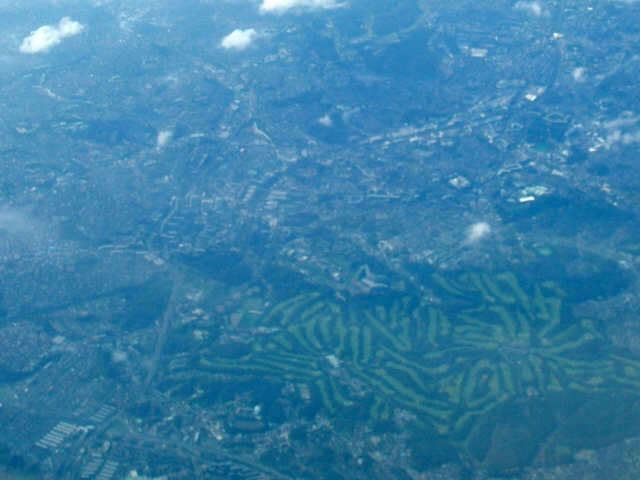 ネット予約の際、左側の翼を避けた窓際を予約した。羽田から西へ向う飛行機は、自宅が見えるコースを飛ぶことが多い。幸い離陸する頃には雲が切れ陽も差してきた。東戸塚を見つけるには、戸塚カントリーのゴルフ場を見つけ、鉄道、4つのタワーマンション、環状2号と見つけると自宅が分かる。富士山はあいにく雲に隠れていたが、上空を通過するとき、山頂が確認できた。木曽路の中山道らしきものも見えた(今度知り合いの機長に確認してみよっと)。