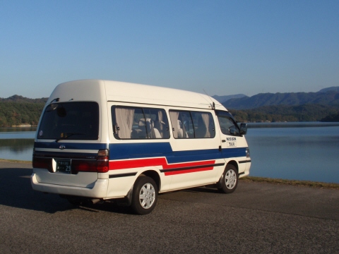 利用したジャンボタクシー(上左写真は満濃池の畔にて)は、補助席1つを 入れて10人乗りで、ツアーの募集定員8名のところ、今回の参加者は4人 ということで余裕がありました。運転席横の助手席や折りたたみの補助席を除くと、 二人・二人・三人掛けシートなので、一人・一人・二人という配置で利用しました。