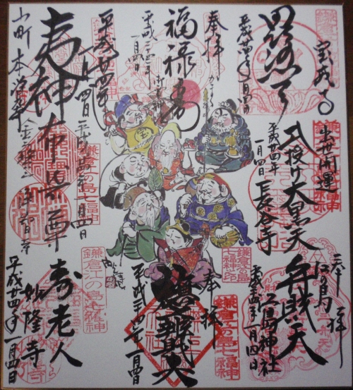 七福神ですが、江ノ島の弁財天を入れると8箇所。ここをを省略した 「鎌倉七福神」というのでもいいようですが、色紙タイプだと8箇所ないと 収まりが悪いような感じですかね。鎌倉市内だけで済ませたい場合は、 色紙ではなく御朱印帳タイプを選んだ方がいいかも知れません。
