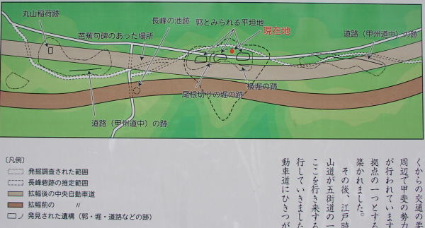 そもそも甲州街道は中央道沿いのため、本当の旧道は失われている個所が多い。長峰の砦跡の碑(写真左)がある場所も以前と変わっている。ここにある説明板の中に旧甲州街道が発掘された地図も示されているが、高速道路に分断されていることが分かる。