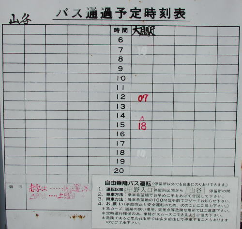 石畳が終ると県道に合流し、少し進むと大月市に入るが、ここからはひたすら下って行く。山谷にはバス停もあるが、大月に向かうバスは1日に1本程度である(時刻表)。車道は大きく蛇行するが、歩行者は通学路と書かれたところを進んだ方が近道である。