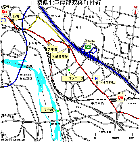 実際の甲州ウォークのとき私はショッピングセンターのところ(竜地交差点)を左に曲がり、JR線の手前で旧道に合流した。当時は建設中であった中部横断自動車道は、2002年に双葉−白根間が開通した。中央線のガードを潜ったら線路沿いの道で韮崎へ向かう。