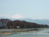 実際の甲州ウォークのときは道を直進してしまったが、旧道は田畑の交差点から右の道に入るようだ。JRの線路脇の道よりひとつ手前で左折。道なりに進み、金剛寺の方には行かず、道を下り元の県道に出る。以前はここ(現在の塩川橋より約200メートル下流)で塩川を渡ったそうだが、これは明治期のルートであり、江戸期には現在の塩川橋に近い位置で渡っていたとする文献もある。塩川橋を渡ると韮崎市に入る。塩川と富士という構図もなかなか良いものがある。