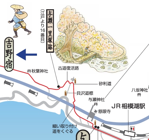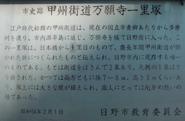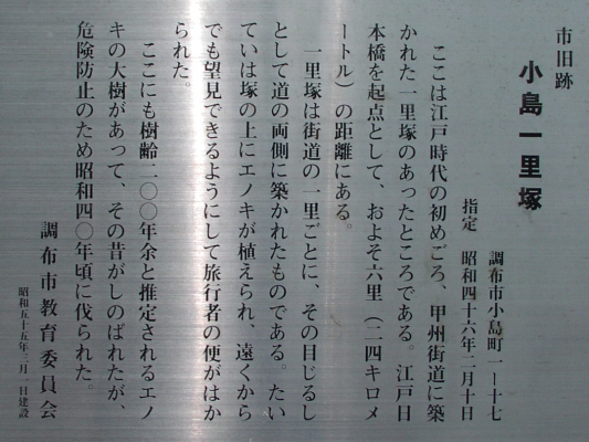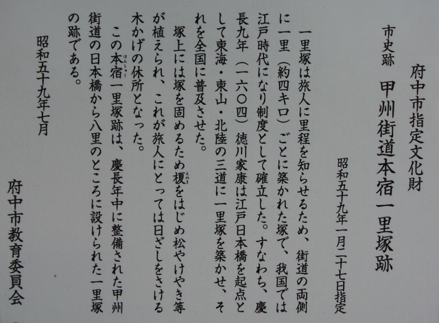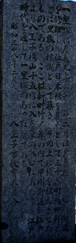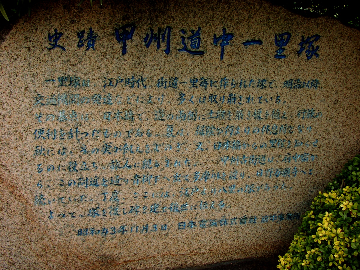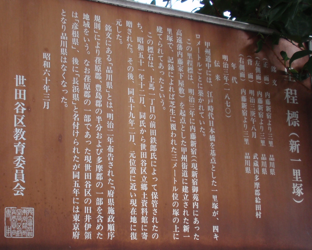 京王線上北沢駅近くの国道20号と首都高速道路が分かれていく辺り(鎌倉街道入口交差点付近)、国道20号の左(南)側の16kmポストがあるところに一里塚の説明板があります。1里は4kmではなく、3927mなので、もう少し東側のような気がしないでもありません。桜上水駅近くの国道20号に「一里塚」というバス停があります。今井金吾さんの今昔三道中独案内によると桜上水駅近くの国道沿いに一里塚が示されています。また、平成10年(1998年)東京都教育委員会発行の「歴史の道