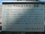 ここも現在の甲州街道から少し離れているので見逃しやすく、かつ見つけ難いです。本来の旧道は、この付近で中央本線を横切るルートだったようです。金沢宿から茅野へ向かう方向だと、中央道を潜り、宮川交差点の手前の新田中(しんでんなか)バス停近くの小路を線路方向入り、さらに民家の裏のようなところにあります。読みづらくなっていた説明板は新しいものに更新されましたが、文面と場所はそのままです。