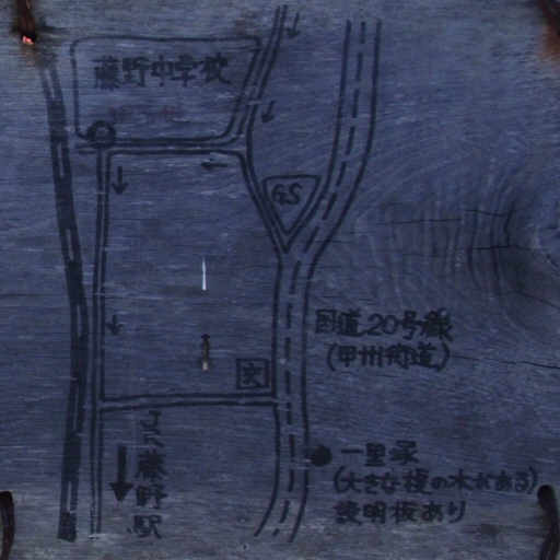分間延絵図では矢立の杉よりも峠側に描かれています。三軒茶屋付近(明治天皇御野立所付近)という意見もあります。独案内によると黒野田宿と駒飼宿の距離は二里五町三十二間となっていますので、笹子峠区間に一里塚は一か所のはずですが、山間部は進行も遅くなるので、実距離的には短めで設置された可能性もあり、実は笹子峠区間で2箇所に一里塚があり総計53になるということはないでしょうか? ちなみに天保国絵図では峠近くに一箇所のみです。