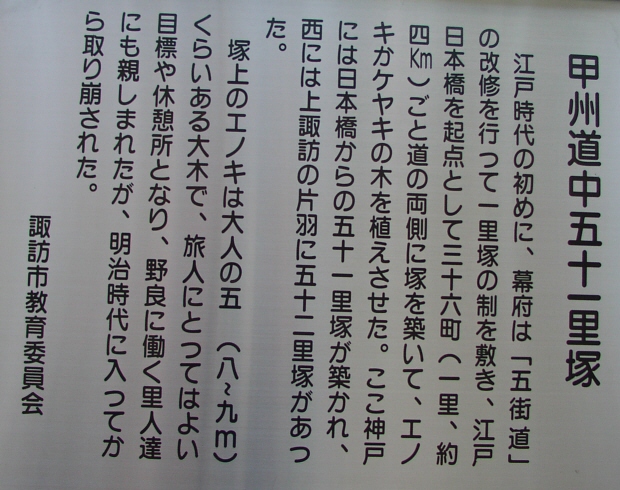 甲州道中の一里塚、一般的には53ケ所です。長野県内の一里塚が江戸からそれぞれ46里から53里と説明されているために53というのが動かしがたいところです。しかし、このページで紹介するのは下諏訪近くの富部を52番目としました。