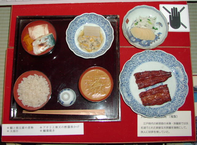 新居関所に対し道の反対側を少し進んだところには、旅籠紀伊国屋資料館がある(入館料200円)。東海道ウォークとして歩いたときは、まだオープンしていなかったが、2001年10月に開館した。私は、2002年の1月に訪れた。旅籠なので本陣の造りとは異なり、大きな民宿といった感じである。紀伊国屋名物の鰻蒲焼の複製は、関所の資料館のものと同じようだ。蒲焼のたれを蓄えたカメは、実際には見え難いが、フラッシュ付で写真を撮ると良く分かる。
