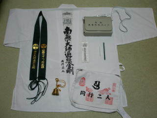 遍路用品の手配も旅行会社経由でできるが料金は別。絶対に白装束でなければダメという訳でもないが、せっかくなんで形から入ると線香や納経帳なども含め2万5千円ほど掛かる(右表参照)。ズボンは白っぽいものを事前に別途購入している。